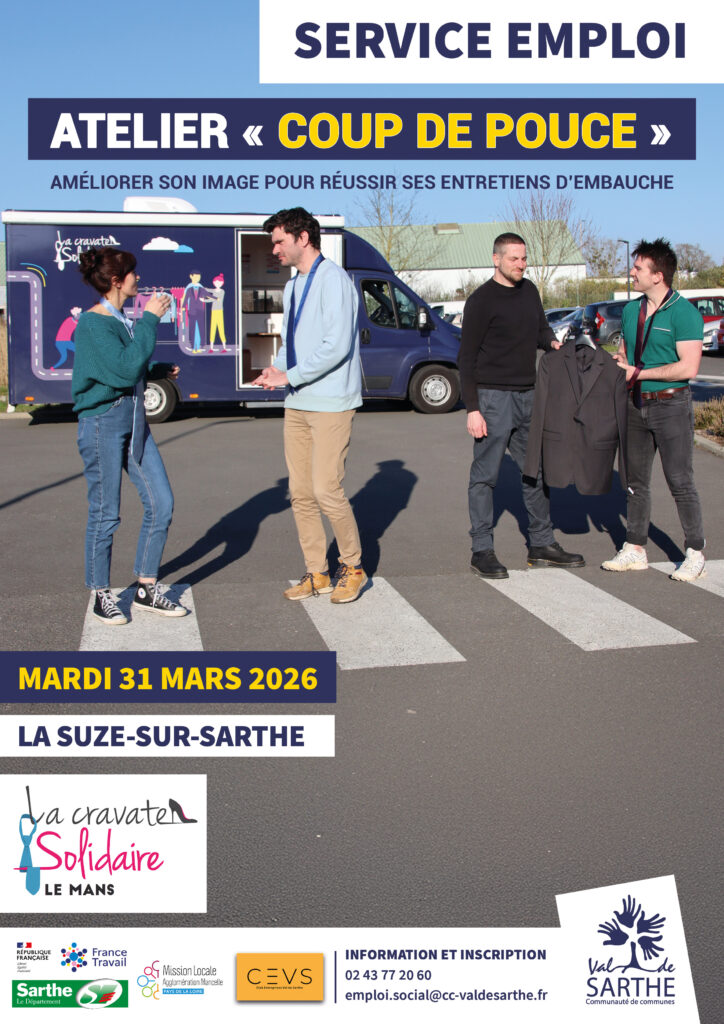 Le service Emploi de la Communauté de communes du Val de Sarthe, en collaboration avec la Cravate Solidaire, organise un atelier « Coup de pouce : améliorer son image pour réussir ses entretiens d’embauche » le mardi 31 mars à l’Espace Communautaire à La Suze-sur-Sarthe. Inscription au 02 43 77 20 60 ou par mail à emploi.social@cc-valdesarthe.fr
