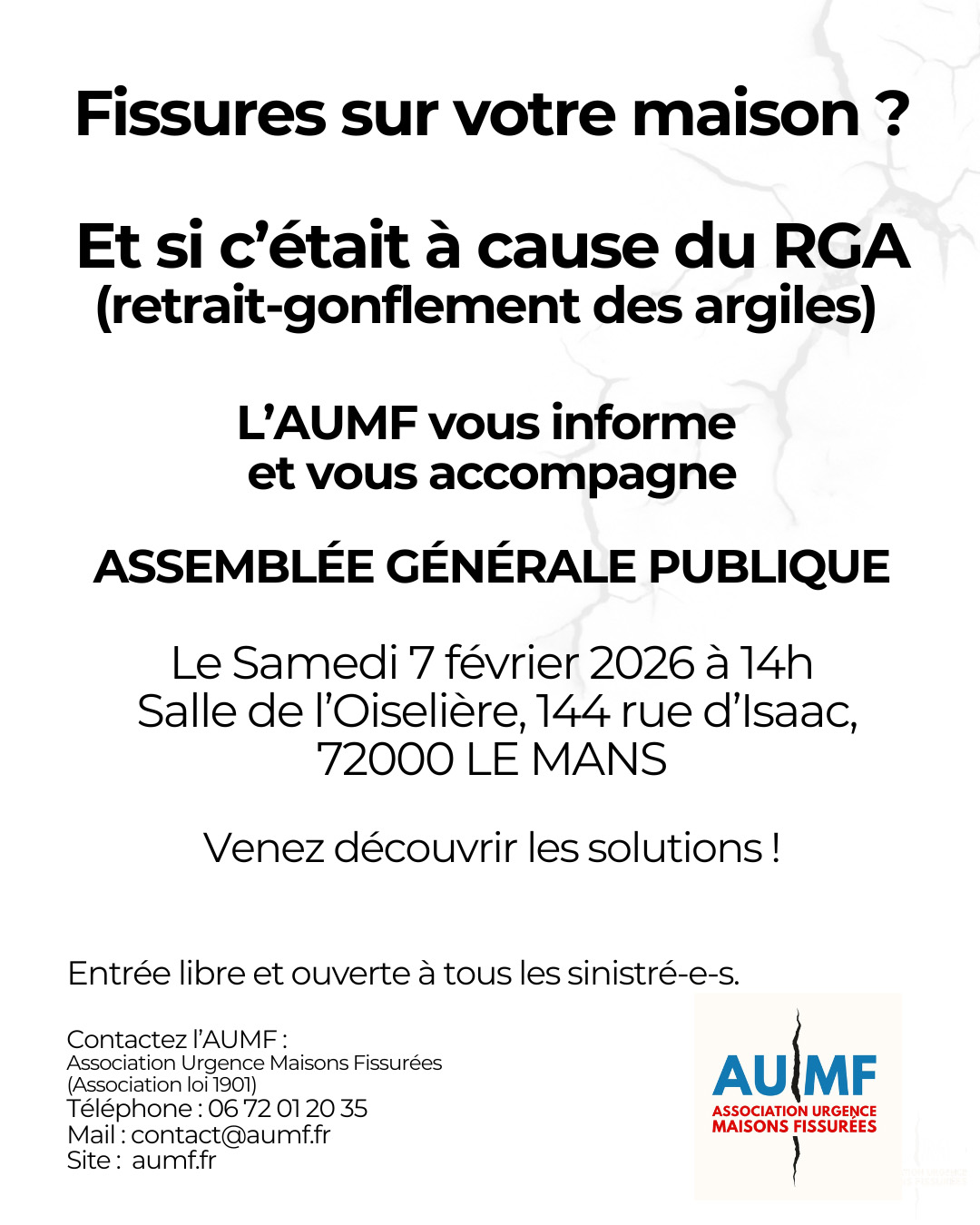 L’AUMF (Association Urgence Maisons Fissurées) organise son Assemblée Générale Ordinaire publique pour informer et accompagner les sinistrés de votre territoire le samedi 7 février 2026 à 14h, à la salle de l’Oiselière, 144 rue d’Isaac, LE MANS.