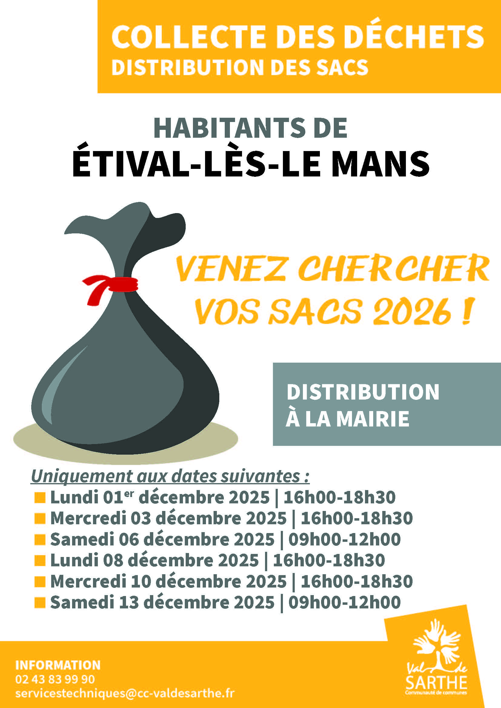 Ces sacs estampillés « Val de Sarthe » sont fournis gratuitement aux habitants par la Communauté de Communes du Val de Sarthe en fonction du nombre de personnes au foyer.